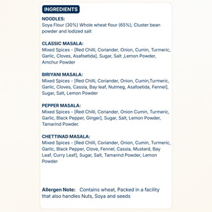 Noodles: Soya Flour (30%) Whole wheat flour (65%), Cluster bean powder and Iodized salt